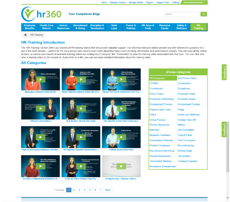 The ‘HR Training’ section offers you dozens of HR training videos that will provide valuable support. Our attorney-reviewed videos provide you with bottom line guidance in a just a few brief minutes -- perfect for the busy person who need to learn more about key topics such as hiring, termination and performance reviews. You can view all the videos at once, or narrow your search of available training videos by clicking on a ‘Category’ like ‘Termination’ to view the training video associated with that topic. You can click and view a training video on this screen or, if you click on a title, you can see more detailed information about the training video.